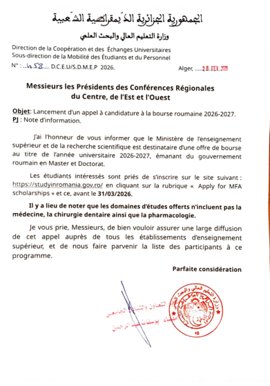 Bourse Roumanie 2026-2027 Master et PhD avec PJ